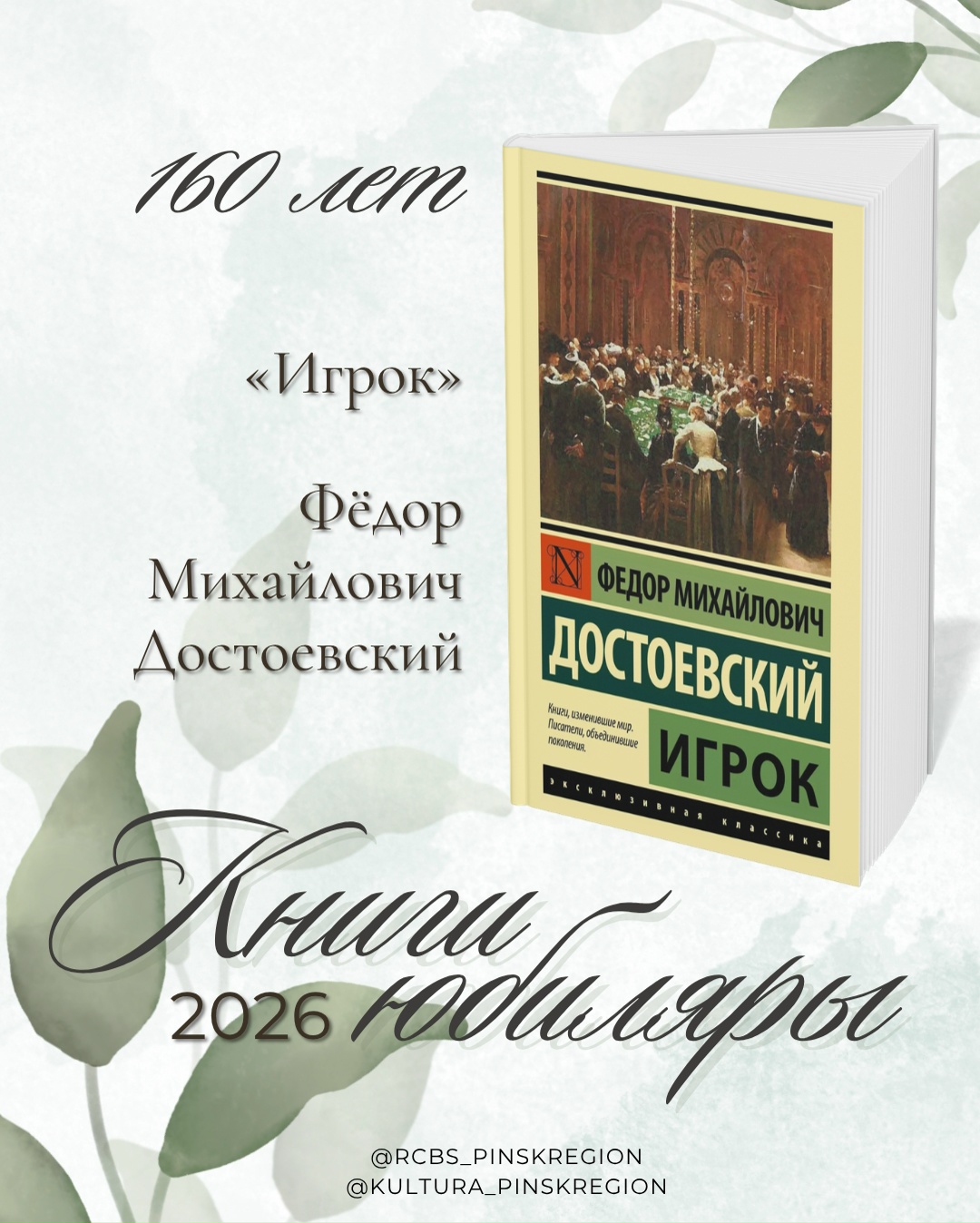 Библиотеки Пинского района представляют. В 2026 году исполняется 160 лет с момента первой публикации романа «Игрок» (1866) Фёдора Достоевского.