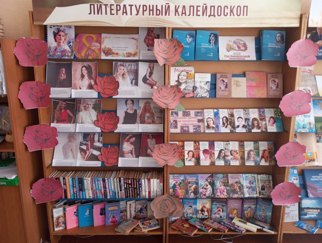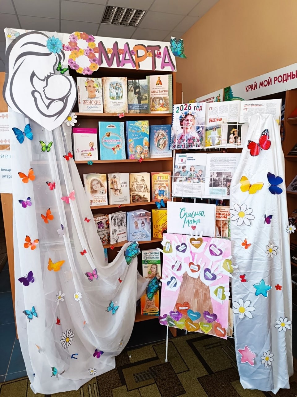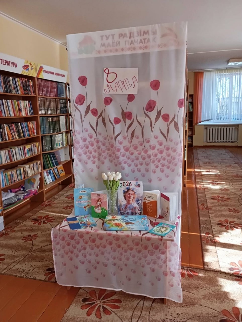 Посетители могут познакомиться с произведениями белорусских и зарубежных авторов, поэтическими сборниками и книгами о женских судьбах. Для создания праздничного настроения оформлены фотозоны с весенним декором.