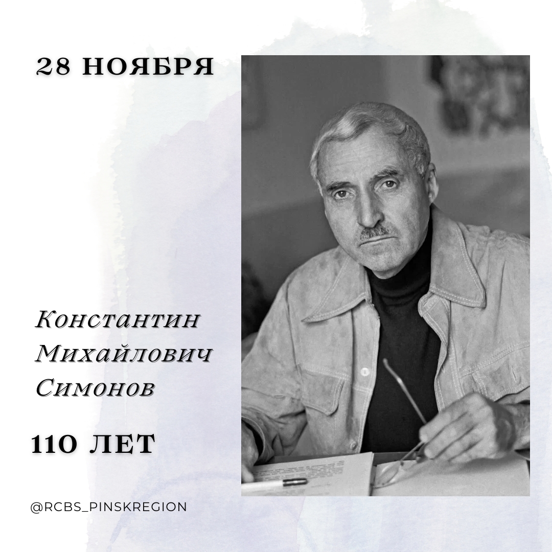 110 лет со дня рождения Константина Симонова. Константин Михайлович Симонов (1915–1979) — известный советский писатель, поэт и журналист, чьё творчество прочно связано с темой войны.Родился 28 ноября 1915 года в Петрограде. При рождении получил имя Кирилл, но позже взял псевдоним Константин из-за трудностей с произношением. После семи классов школы пошёл в фабрично-заводское училище, работал токарем в Саратове и Москве. В 1938 году окончил Литературный институт им. А.М. Горького.